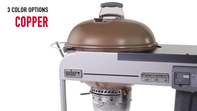 The weber 22 performer deluxe grill has color options and includes electronic ignition large work table lcd cook timer and charcoal storage bin.